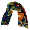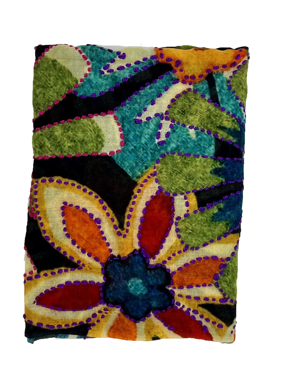 Sjaal met bloemmotieven. Met vroijke kleuren: blauw, oranje, bordeaux, geel, groen en beige.100% wol met kleurijkijke borduursels.