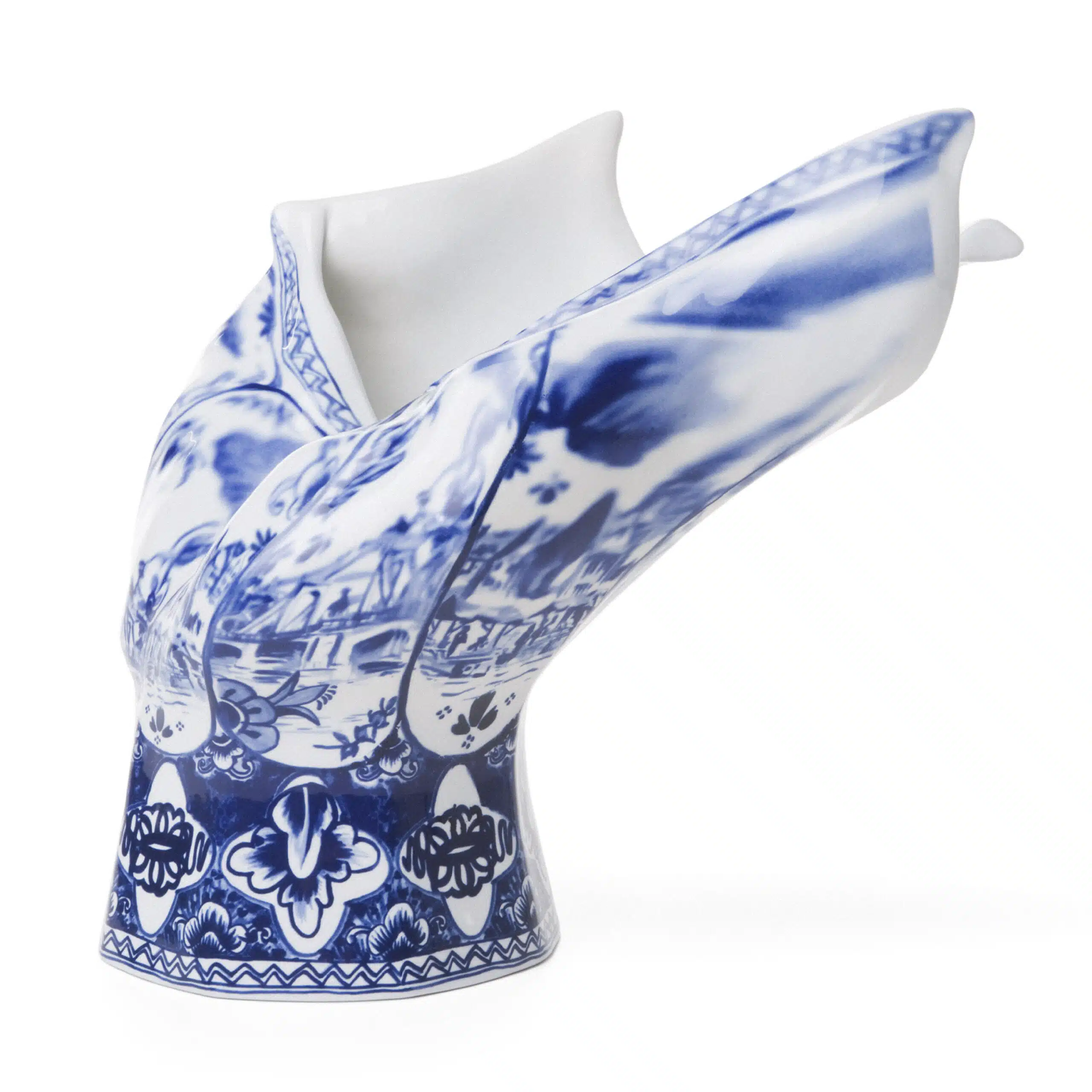 De Blow Away Vase is een klassieke vaas die iets heel bizars heeft meegemaakt… hij is opzij geblazen door een krachtige windvlaag. De schoonheid van de vaas ligt in het feit dat hij gebogen maar niet verslagen is. De Blow Away vaas is ontworpen door de Zweedse design studio Front. Deze vaas is onderdeel van de Moooi x Royal Delft collectie. De collectie bestaat uit interieur objecten met gedurfde vormen, gecombineerd met iconische Delfts Blauwe decoratie. Royal Delft is al geruime tijd fabrikant voor de Delfts Blauwe vazencollectie van Moooi. De vazen uit de Moooi x Royal Delft collectie worden met de handgemaakt in het atelier in Delft, met oog voor detail en hoge kwaliteit.